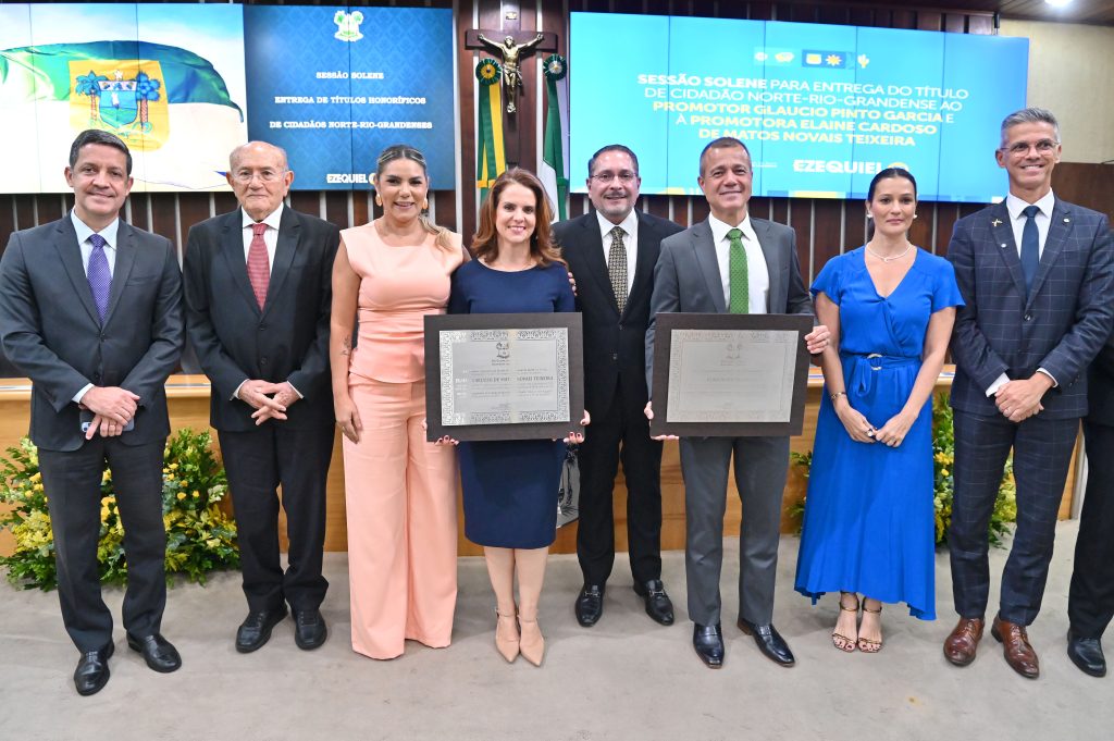 A tarde desta quarta-feira (5) foi marcada por homenagens na Assembleia Legislativa do Rio Grande do Norte. Por iniciativa do presidente da Casa, deputado Ezequiel Ferreira (PSDB), o Legislativo concedeu o título honorífico de Cidadãos Norte-Rio-Grandenses ao procurador-geral de Justiça do Estado, Gláucio Pinto Garcia, e à ex-procuradora-geral de Justiça Elaine Cardoso. A solenidade contou com a presença de autoridades, familiares e amigos dos homenageados, ocasião em que Ezequiel Ferreira enalteceu as trajetórias dos novos potiguares.