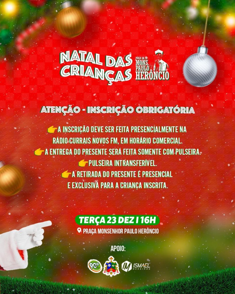 Para participar, é obrigatória a inscrição, feita presencialmente na Rádio Currais Novos FM, em horário comercial. A entrega dos presentes ocorrerá mediante pulseira, que é intransferível, e o presente será entregue exclusivamente à criança inscrita.