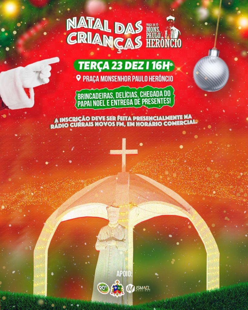 A Praça da Fé Monsenhor Paulo Herôncio realiza, nesta terça-feira (23), a partir das 16h, mais uma edição do Natal das Crianças, em Currais Novos, reunindo famílias em um momento de fé, solidariedade e alegria.