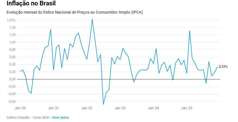 O Índice Nacional de Preços ao Consumidor Amplo (IPCA) fechou dezembro com alta de 0,33%, ante um avanço de 0,18% em novembro, informou nesta sexta-feira, 9, o Instituto Brasileiro de Geografia e Estatística (IBGE). O resultado foi o menor para um mês de dezembro desde 2018.