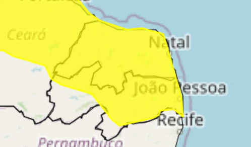 O Instituto Nacional de Meteorologia (Inmet) emitiu nesta segunda-feira (9) um alerta amarelo de perigo potencial para todo o estado do Rio Grande do Norte. O aviso começou às 10h desta segunda-feira e segue válido até as 23h59 de terça-feira (10).