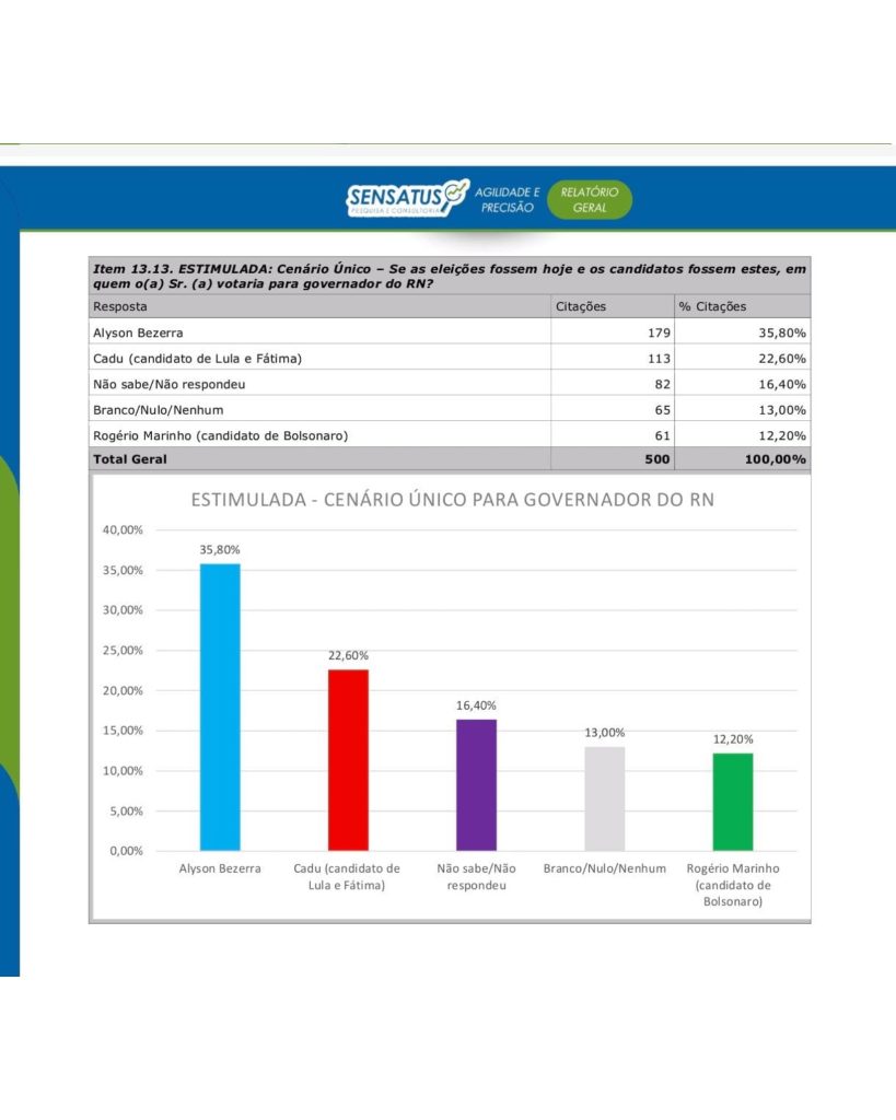Na pesquisa estimulada para Governador em Currais Novos, o Instituto Sensatus destacou que Alyson Bezerra lidera com 35,8%, em segundo vem Cadú Xavier (candidato de Lula e Fátima) com 22,6% e em terceiro vem Rogério Marinho (Candidato de Bolsonaro) com 12,2%.
