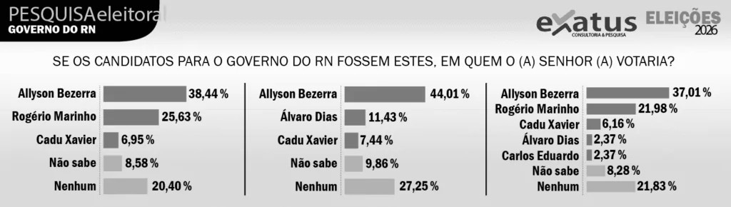 O prefeito de Mossoró, Allyson Bezerra (União), segue liderando a corrida para o Governo do Estado nas eleições de 2026. Nova pesquisa do Instituto Exatus, do Grupo Agora RN, mostra que Allyson tem vantagem significativa nos três cenários testados. Os números se referem à pesquisa estimulada – quando o eleitor recebe uma lista de nomes e precisa escolher uma opção.