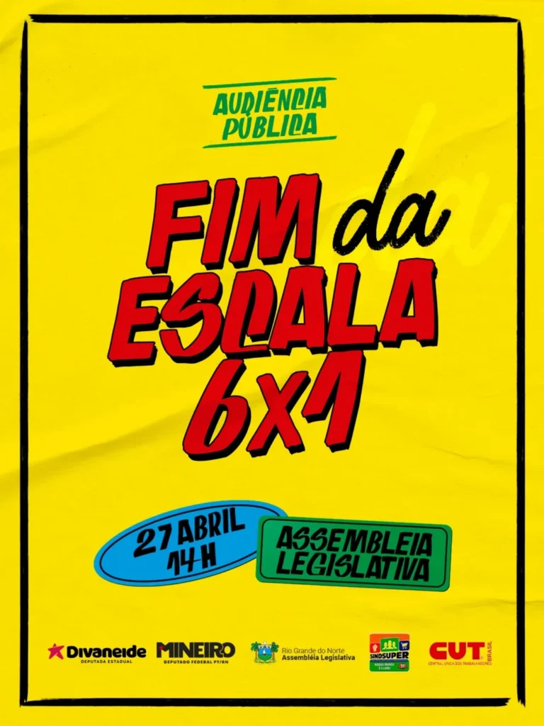 A Assembleia Legislativa do RN sediará, no próximo dia 27 de abril, uma audiência pública para discutir o fim da escala de trabalho 6×1, modelo que prevê seis dias consecutivos de trabalho para apenas um de descanso. A iniciativa é da deputada estadual Divaneide Basilio (PT), em parceria com o deputado federal Fernando Mineiro (PT). A proposta é reunir representantes da sociedade civil, especialistas, trabalhadores e entidades para construir, de forma coletiva, alternativas que promovam maior equilíbrio entre vida profissional e bem-estar. O encontro será realizado a partir das 14h e propõe ampliar o debate sobre direitos trabalhistas, qualidade de vida e valorização da classe trabalhadora.