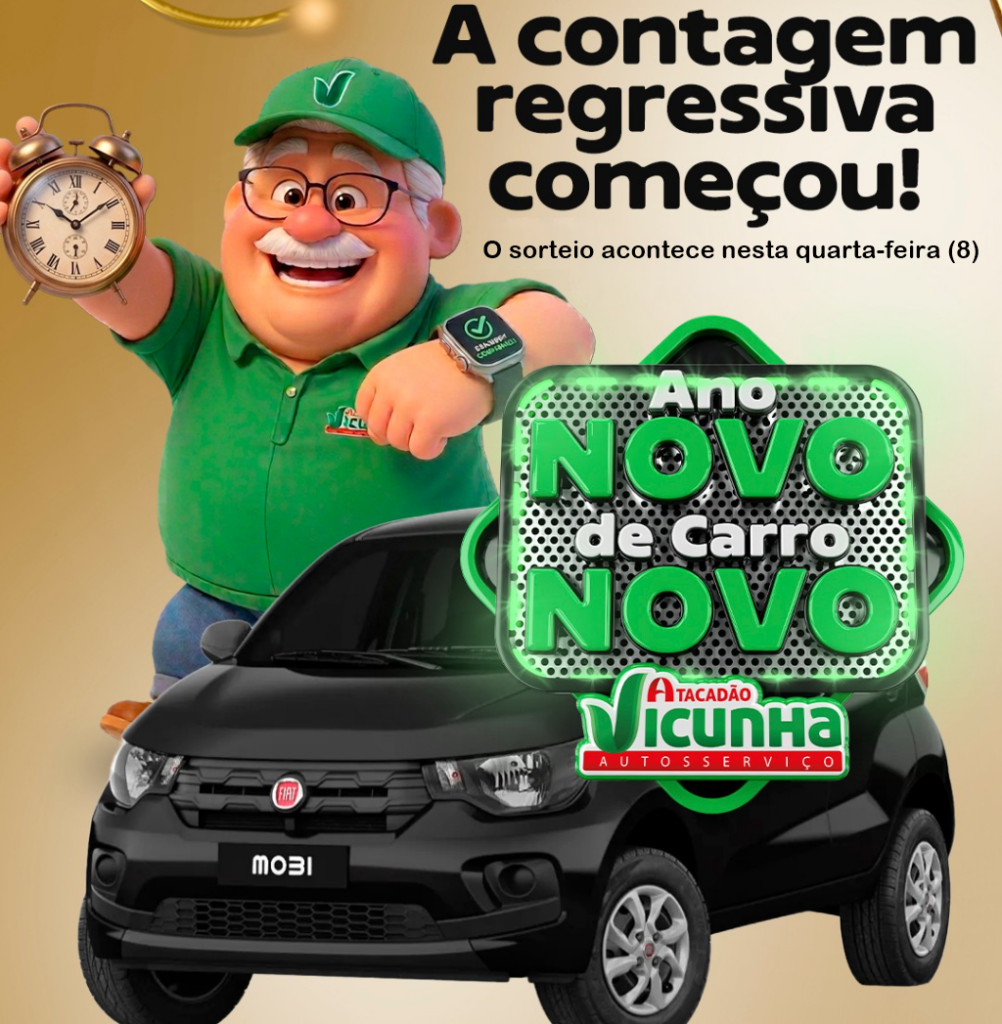 “Quem economiza no Vicunha pode sair de lá dirigindo um carro 0 km. No dia 8 de abril, será sorteado o 27º carro da história do Atacadão Vicunha.”