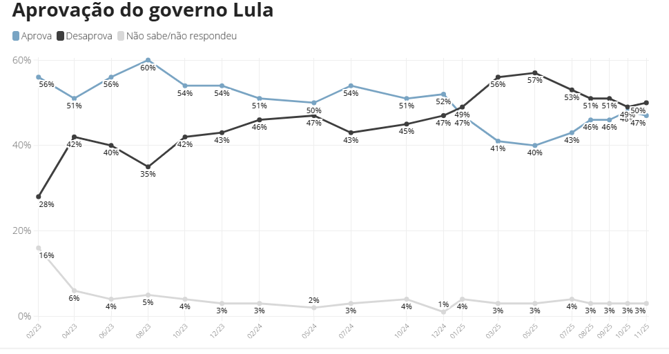 A diferença entre aprovação e desaprovação está agora em três pontos. Na pesquisa anterior, estava em um ponto. Entre fevereiro e setembro, a desaprovação estava maior, com pico de diferença em maio, quando 17 pontos separavam a avaliação negativa (57%) da positiva (40%). Em dezembro de 2024, a aprovação era maior (52% a 47%).