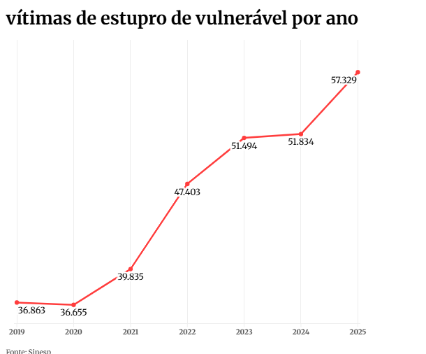 Entre os anos de 2019 e 2025, o Brasil registrou 321.413 vítimas de estupro de vulnerável. Em sete anos, foi registrado um aumento de 55,5%. O ano de 2025 bateu recorde no número de casos, com 57.329 vítimas — uma variação de 10,6% em relação ao ano passado, com 51.834.