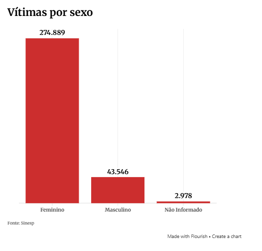Meninas e mulheres correspondem à maioria das vítimas do crime. Nos últimos sete anos, elas corresponderam a 85,5%, um total de 274.889. Enquanto isso, sexo masculino totalizou 43.646 casos (13,5%). As vítimas que não tiveram o sexo identificado corresponderam à minoria, com 2.978 crimes (0,9%).