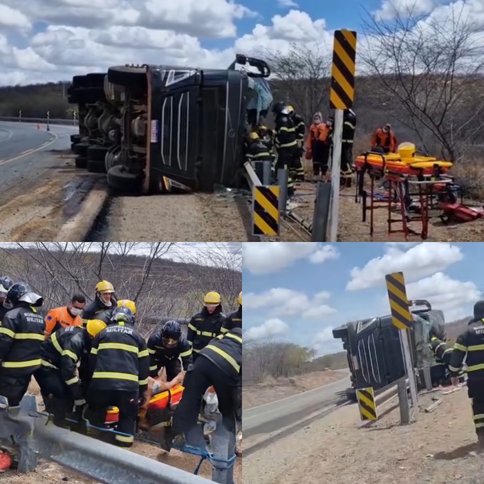 Na manhã deste sábado (29), um grave acidente mobilizou equipes do Corpo de Bombeiros Militar de Currais Novos após o tombamento de uma carreta que transportava rocha ornamental. A ocorrência foi registrada por volta das 10h26, quando o motorista, identificado como Osmagno Oliveira, de 31 anos, perdeu o controle do veículo e acabou ficando preso às ferragens.