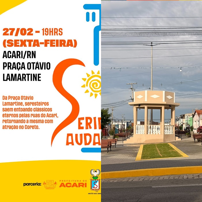 Logo após a inauguração, às 19h, a programação cultural toma conta da noite com o “Seridó de Saudades”, uma bela manifestação que percorre as ruas de Acari levando canções sentimentais que celebram as raízes e a identidade do povo seridoense. O evento será realizado na própria Praça Otávio Lamartine, proporcionando um encontro marcado por memórias, tradição e emoção.