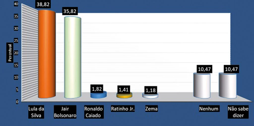 Lula aparece com 38,82% e Bolsonaro, 35,82%, seguidos dos governadores de Goiás, Ronaldo Caiado (União Brasil), 1,82; do Paraná, Ratinho Júnior (PSD), 1,41% e de Minas Gerais, Romeu Zema (NOVO), 1,18%.