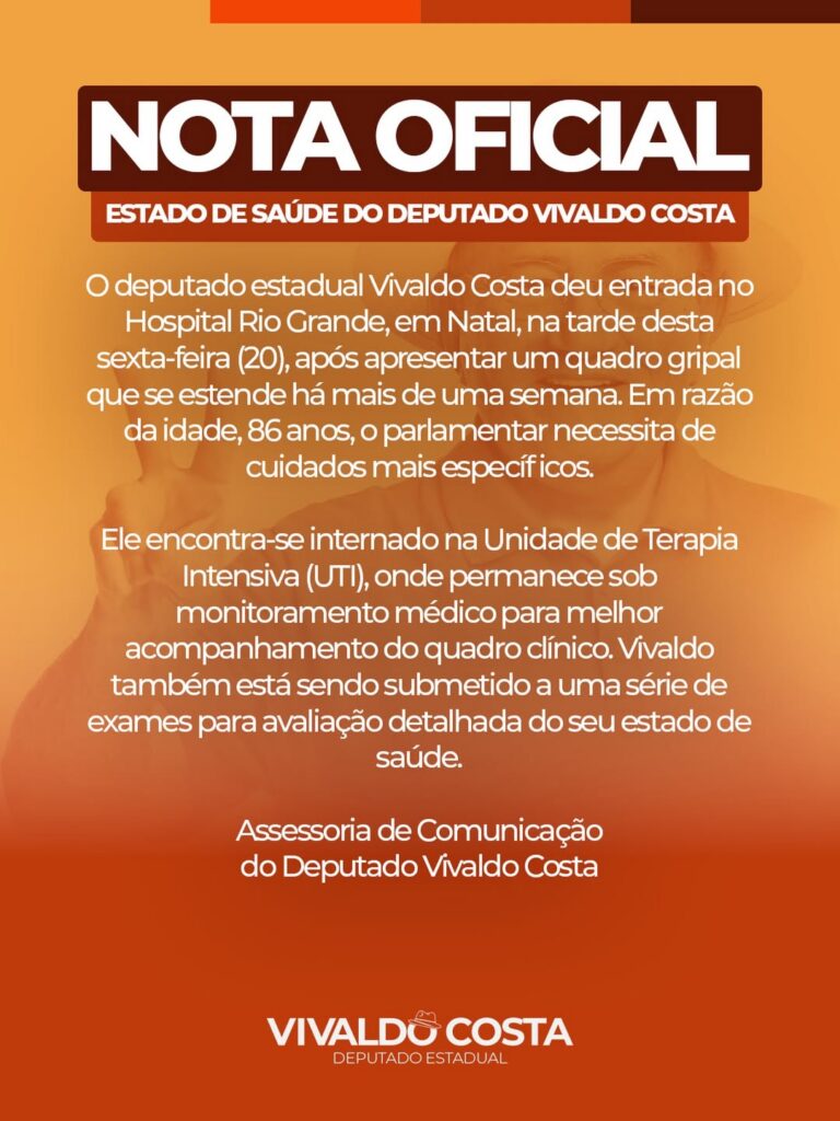 O deputado estadual Vivaldo Costa foi internado nesta sexta-feira (20) no Hospital Rio Grande, em Natal, após apresentar um quadro gripal que persiste há mais de uma semana. De acordo com nota oficial, em razão da idade, 86 anos, o parlamentar necessita de cuidados médicos mais específicos.