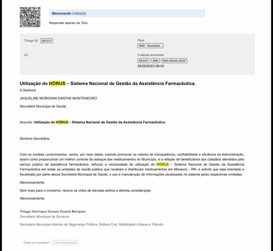 “No dia 4 de agosto de 2023, o prefeito enviou, por meio do Gabinete, um memorando à Secretaria Municipal de Saúde e a todas as gerências da área, reiterando a obrigatoriedade da utilização do sistema Hórus na Rede Municipal de Saúde”, disse a assessoria de imprensa da Prefeitura de Mossoró.