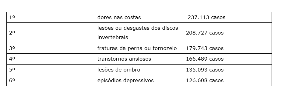 No caso das mulheres, em segundo lugar, aparecem os transtornos ansiosos (118.517), seguidos pelas lesões ou desgastes dos discos intervertebrais (98.305). Já no caso dos homens, em segundo fica a dorsalgia (115.527) e, em terceiro lugar, também as lesões ou desgastes dos discos intervertebrais (110.422), como as hérnias.