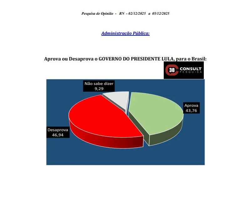 Já o desempenho do governo Lula oscilou positivamente entre os eleitores potiguares, segundo a sondagem. No entanto, o índice de desaprovação ficou em 46,94%, superando o de aprovação de 43,76%.