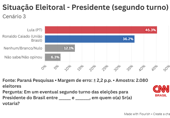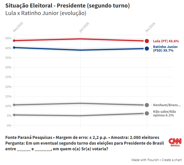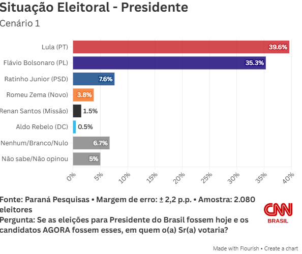 No primeiro cenário avaliado pela pesquisa, Lula tem 39,6% das intenções de voto, contra 35,3% de Flávio. A seguir, aparece o governador do Paraná, Ratinho Junior (PSD), com 7,6%, e o de Minas Gerais, Romeu Zema (Novo), que marca 3,8%.