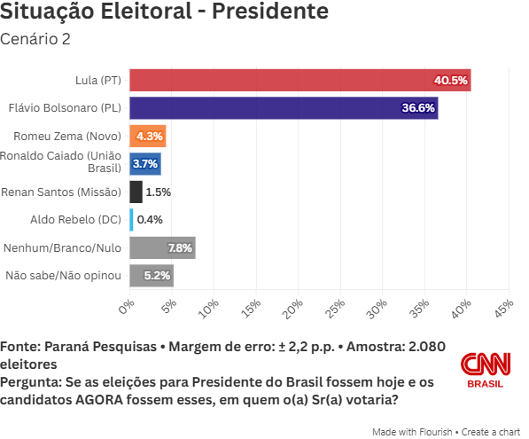 No segundo cenário, Lula desponta com 40,5%, ante 36,6% de Flávio. Na sequência, surge Zema, com 4,3%. O governador de Goiás, Ronaldo Caiado (União), totaliza 3,7%; Renan Santos, 1,5%; e Aldo Rebelo, 0,4%. Votos em branco, nulos e nenhum são 7,8%. Outros 5,2% não souberam ou não opinaram.