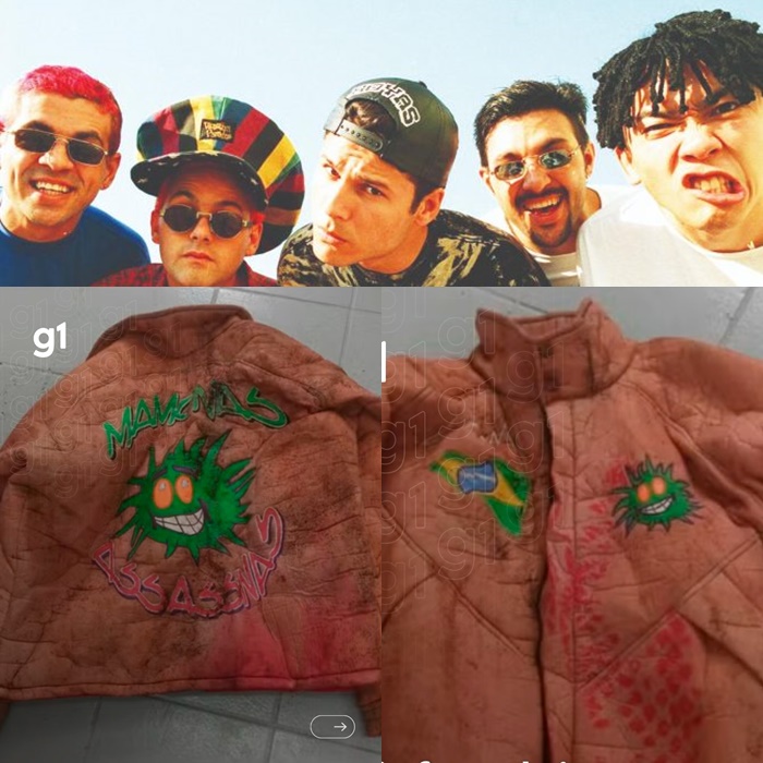 Uma jaqueta usada pela equipe dos Mamonas Assassinas foi encontrada intacta sobre o caixão do cantor Dinho durante o procedimento de exumação realizado no Cemitério Primaveras, em Guarulhos, na Grande São Paulo, nesta segunda-feira (23).