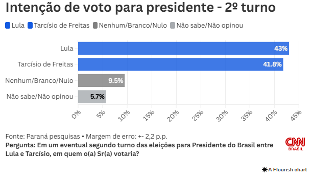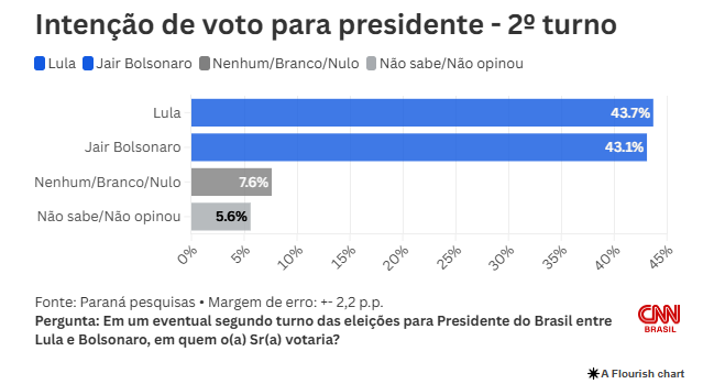 Em um cenário em que Lula disputaria o pleito contra Jair Bolsonaro, o atual mandatário aparece com 43,7% das intenções de votos, enquanto o ex-presidente tem 43,1%.