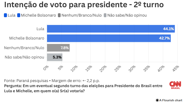 Já contra Michelle, Lula alcança 44,1% dos votos e a ex-primeira-dama soma 42,7%.
