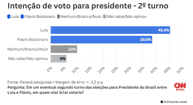 O único cenário em que não há empate técnico é contra o senador Flávio Bolsonaro (PL-RJ). Neste quadro, 45,4% dos brasileiros votariam no petista, enquanto 38,6% escolheriam o senador.