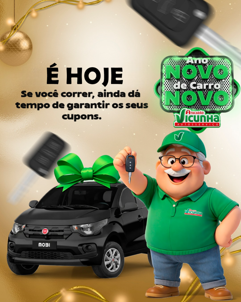🚗 O sorteio acontece hoje, 08 de abril, às 19h. Fique ligado nas redes sociais do Atacadão Vicunha (@atacadaovicunha) para acompanhar todos os detalhes. Boa sorte aos participantes!