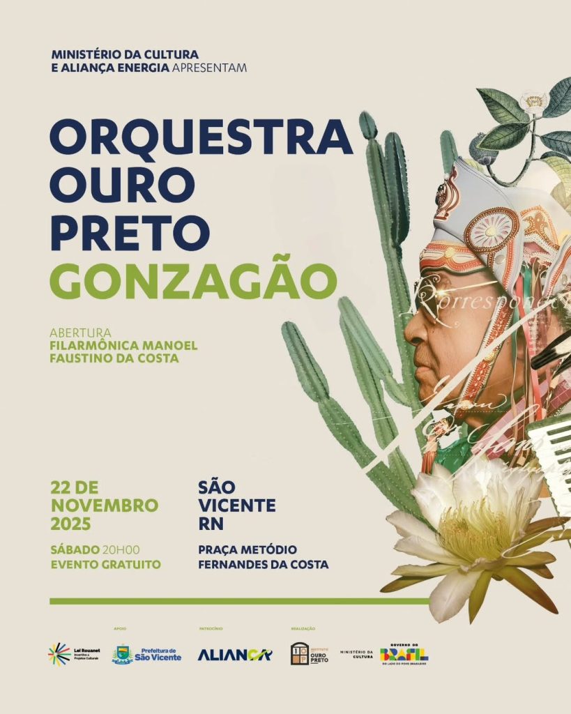 A programação começa com a Filarmônica Manoel Faustino da Costa, representando o talento potiguar e abrindo a noite em grande estilo. Em seguida, o maestro Rodrigo Toffolo assume a regência da Orquestra Ouro Preto, conduzindo o público por uma viagem musical cheia de emoção, ritmo e identidade nordestina.