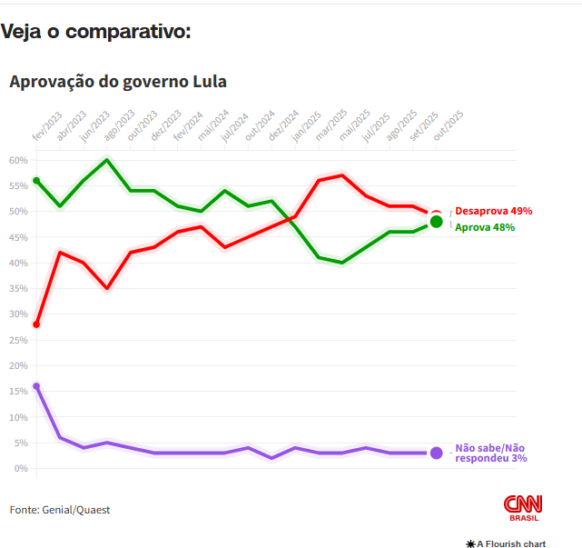 São 48% que aprovam a terceira administração do petista. Os que desaprovam são 49%. Com uma margem de erro de dois pontos percentuais, para mais ou para menos, os índices aparecem em empate técnico.