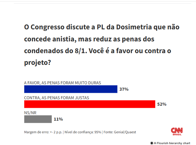 O PL (Projeto de Lei) da Dosimetria é rejeitado por 52% dos entrevistados pela pesquisa Genial/Quaest divulgada nesta quarta-feira (8). O mesmo levantamento mostra que 37% são favoráveis, com a justificativa de que as penas foram muito duas, enquanto 11% estão indecisos ou não responderam.