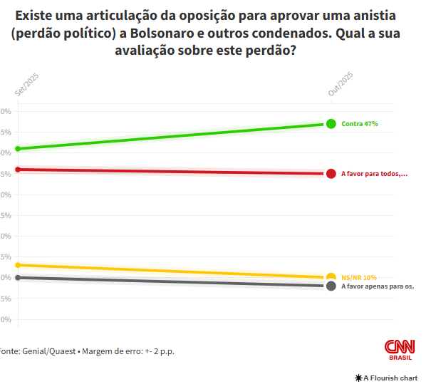 Os contrários ao perdão aumentaram seis pontos percentuais em um mês. Na última pesquisa, realizada pela Genial/Quaest em setembro, os que respondiam ser contra a medida eram 41%.