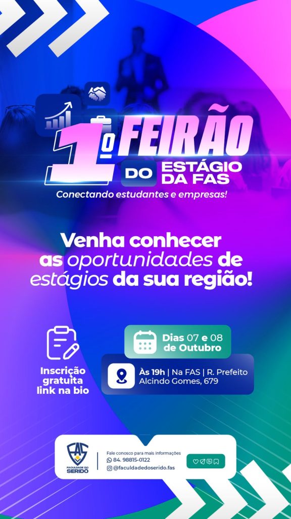 📅 Dias: 07 e 08 de outubro 🕖 Horário: 19h 📍 Local: Faculdade do Seridó – Rua Prefeito Alcindo Gomes, 679 ✅ Inscrição gratuita:https://forms.gle/MmT43ubn22duMEiR7