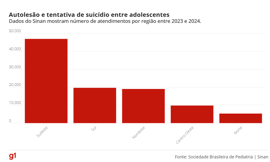 Os dados também mostram a diferença regional no número de atendimentos a adolescentes com problemas de saúde mental. De forma geral, as estatísticas acompanham a densidade populacional.