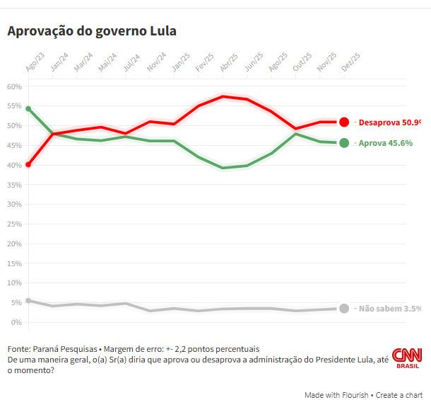O governo do presidente Luiz Inácio Lula da Silva (PT) é desaprovado por 50,9% dos brasileiros e aprovado por 45,6%, segundo levantamento divulgado pelo instituto Paraná Pesquisas nesta segunda-feira (29). Os que não sabem ou não opinaram somam 3,5%.