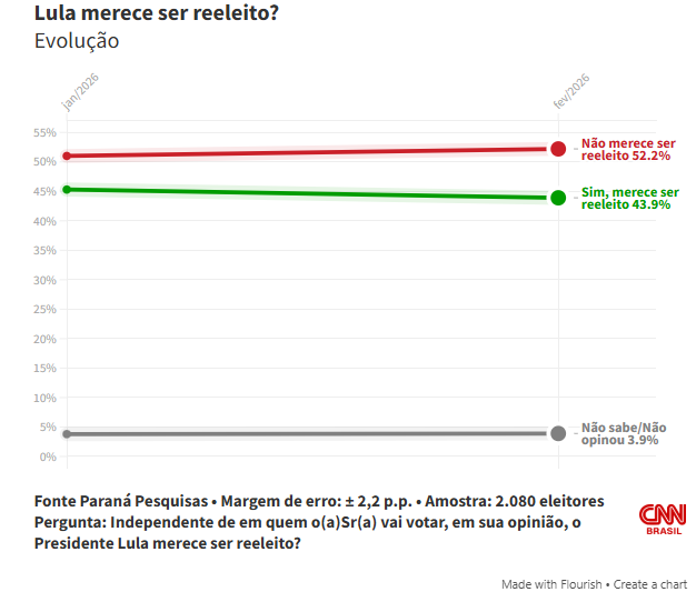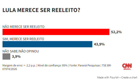 De acordo com a pesquisa, 52,2% dos entrevistados afirmaram que Lula não merece um novo mandato, enquanto 43,9% disseram que ele merece a reeleição. Outros 3,9% não souberam opinar.