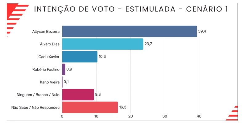 Uma pesquisa do instituto Seta, divulgada em parceria com o Blog do Barreto e o portal O Potiguar, aponta o ex-prefeito de Mossoró Allyson Bezerra (União Brasil) na liderança das intenções de voto para o Governo do RN. No levantamento, ele aparece com 39,4%, seguido pelo ex-prefeito de Natal, Álvaro Dias (PL), com 23,7%, e pelo ex-secretário estadual da Fazenda Cadu Xavier (PT), com 10,3%.
