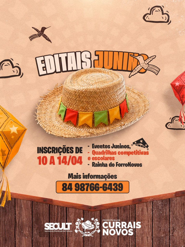 A Prefeitura de Currais Novos, por meio da Secretaria de Cultura, informa que estarão abertas, no período de 10 a 14 de abril, as inscrições para os Editais Juninos, voltados à valorização da cultura popular e das tradições nordestinas.