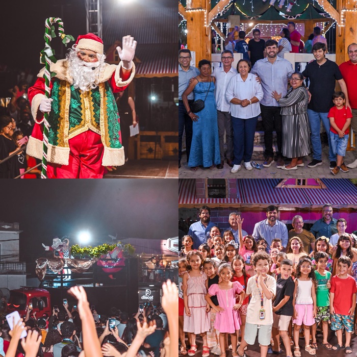 A festa aconteceu na Praça Cristo Rei, no Centro da cidade, com uma programação que contou com espetáculo teatral, música, contagem regressiva e a tão aguardada chegada do Papai Noel à cidade.