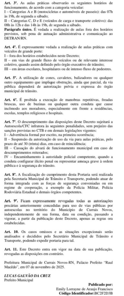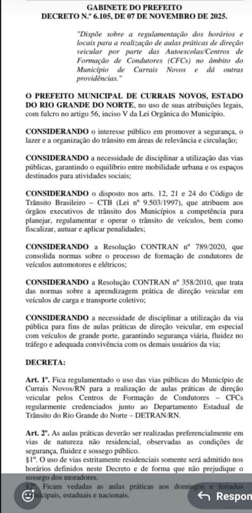 A Prefeitura de Currais Novos publicou no Diário Oficial o Decreto Nº 6.105, de 7 de novembro de 2025, que regulamenta os horários e locais permitidos para a realização de aulas práticas de direção veicular pelas autoescolas e Centros de Formação de Condutores (CFCs) no município.