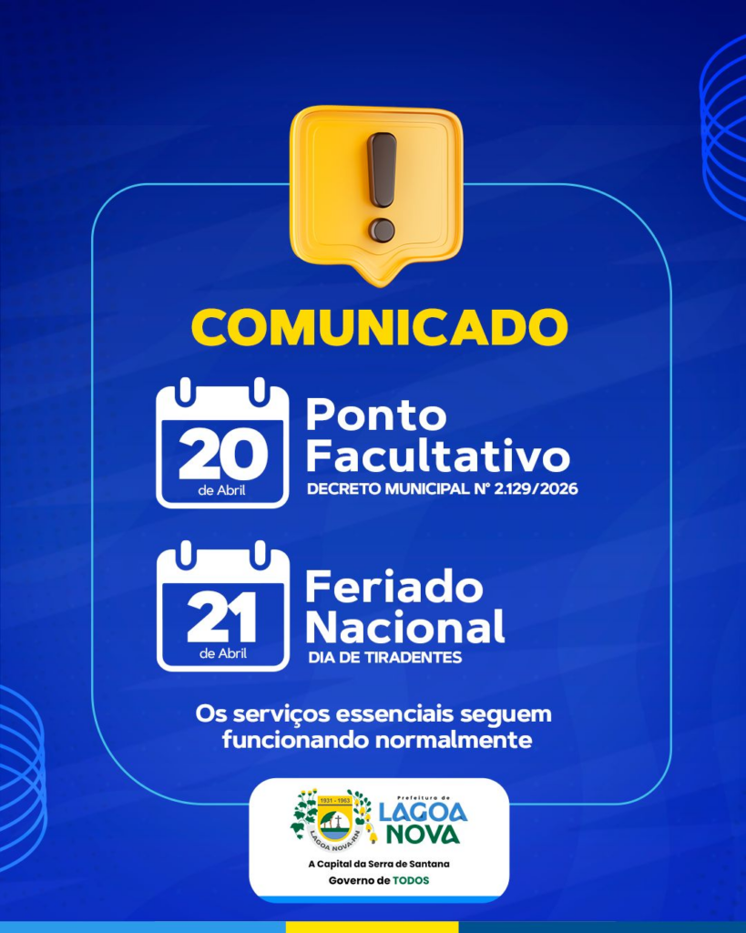 A Prefeitura de Lagoa Nova divulgou comunicado oficial informando alterações no funcionamento dos serviços públicos municipais nos dias 20 e 21 de abril de 2026.
