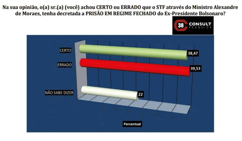 O resultado reflete o ambiente de polarização que tem marcado o debate político nacional. Numericamente, o cenário é de empate técnico entre os que aprovam e os que reprovam a prisão em regime fechado do ex-presidente, visto que a margem de erro da pesquisa é de 2,3 pontos percentuais.