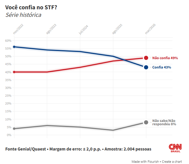 Ao mesmo tempo, a pesquisa de hoje mostra que 49% dos brasileiros desconfiam da Suprema Corte — em agosto passado, esse índice era de 47%. Outros 8% não souberam responder.