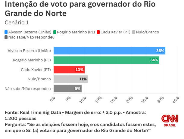 No primeiro cenário testado, Alysson Bezerra tem 36% das intenções de voto, contra 34% de Rogério Marinho. Em seguida, aparece o secretário estadual da Fazenda, Cadu Xavier (PT), com 10%. Votos em branco e nulo somam 11%. Outros 9% não souberam ou não responderam.