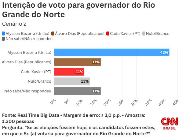 Já no segundo cenário avaliado, sem a presença de Rogério Marinho, Alysson Bezerra tem ampla vantagem sobre os adversários, marcando 42%. Na sequência, surge o ex-prefeito de Natal Álvaro Dias (Republicanos), que assinala 17%. Cadu Xavier completa a lista com 11%.