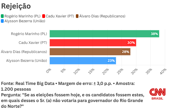 O prefeito de Mossoró (RN), Alysson Bezerra (União), e o senador Rogério Marinho (PL-RN) lideram cenários para uma eventual disputa ao governo do Rio Grande do Norte em 2026, segundo pesquisa divulgada pelo instituto Real Time Big Data nesta quarta-feira (3).