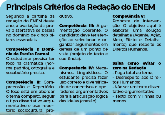Considerada uma das etapas mais temidas do Enem, a redação exige que o candidato produza um texto dissertativo argumentativo em até 30 linhas, sobre um tema de relevância social, cultural, científica ou política. O desafio não é pequeno: além de defender uma tese com clareza e coesão, o estudante precisa mobilizar repertório sociocultural, construir bons argumentos e ainda propor uma intervenção para o problema apresentado, sempre em conformidade com os direitos humanos.