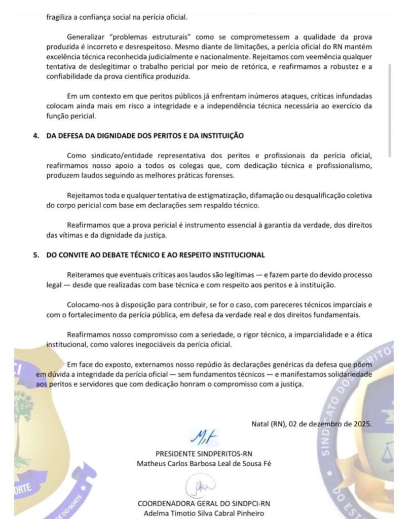 Na nota, as entidades reforçam que os peritos do RN são devidamente habilitados, seguem protocolos rigorosos e desempenham papel fundamental para a verdade real e para a Justiça. Por isso, desqualificar laudos sem fundamento técnico atinge a credibilidade da instituição e expõe injustamente toda a categoria.