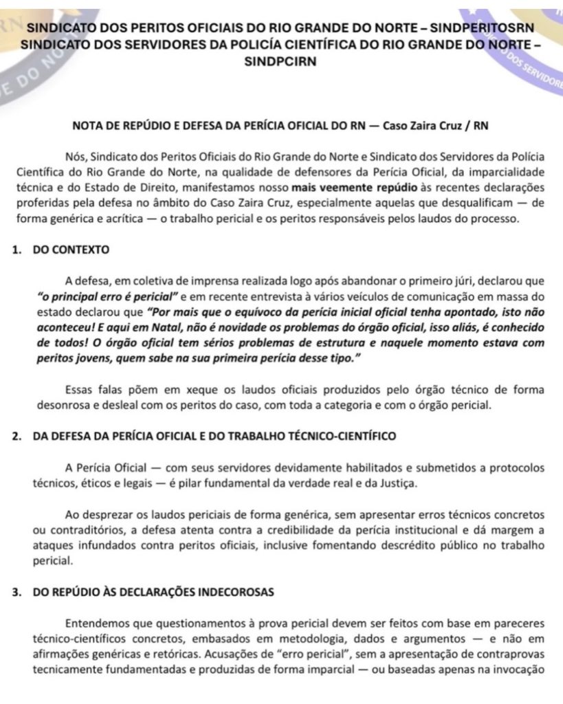 Os sindicatos que representam os peritos oficiais do Rio Grande do Norte divulgaram uma nota de repúdio contra declarações feitas pela defesa no Caso Zaira Cruz. Segundo a categoria, as falas colocam em dúvida, de forma injusta e sem respaldo técnico, o trabalho dos profissionais responsáveis pelos laudos oficiais.