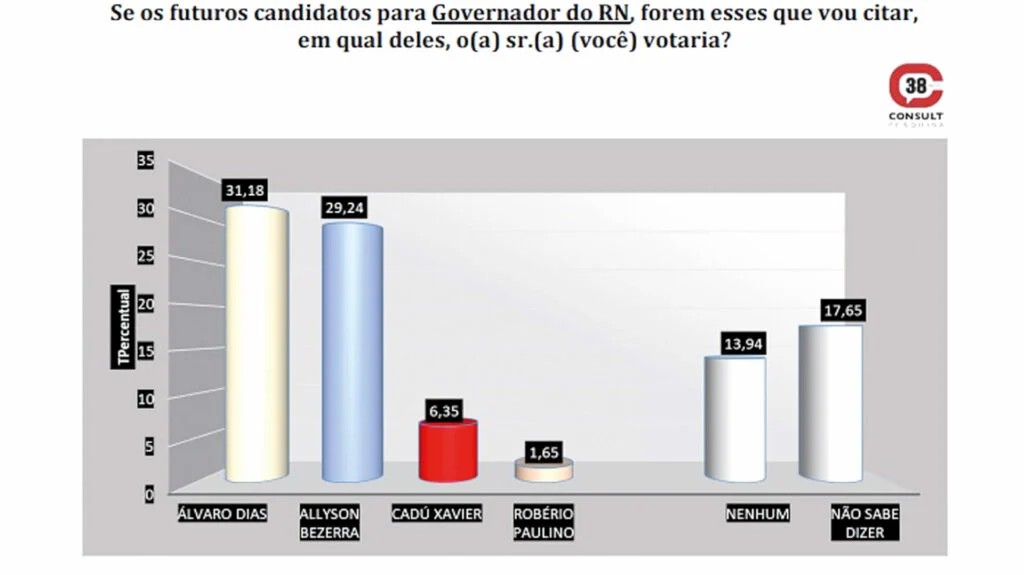 Pesquisa TRIBUNA DO NORTE/ Instituto Consult feita no começo da semana (15 – 18 de março) indica um empate técnico nas duas primeiras colocações na disputa para governo do Estado. Praticamente dois meses depois de ter anunciado sua pré-candidatura ao governo estadual ao pleito de 4 de outubro, o ex-prefeito de Natal, Álvaro Dias, que está de saída do Republicanos para o Partido Liberal (PL), aparece na liderança, com 31,18% das intenções de votos, seguido pelo prefeito de Mossoró, Allyson Bezerra (União Brasil), com 29,24.