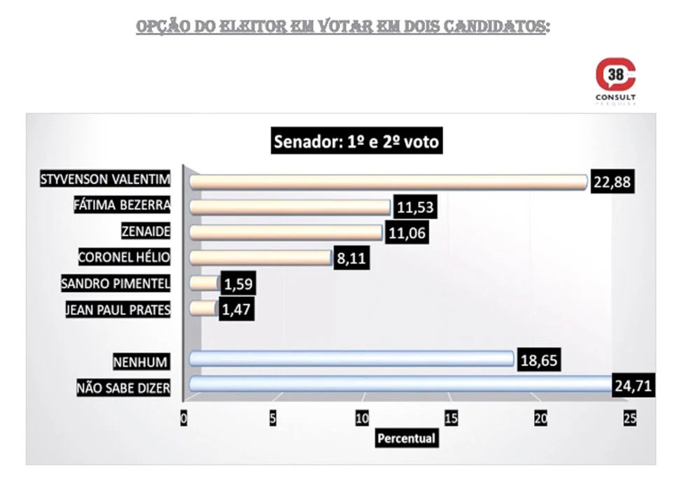 Considerando-se a soma do primeiro e segundo votos — já que o eleitor pode escolher dois candidatos — Styvenson Valentim mantém a liderança com 22,88%, seguido da governadora Fátima Bezerra (PT), com 11,53% e Zenaide Maia (PSD), 11,06%, que aparecem tecnicamente empatadas na segunda posição.